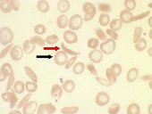 Bei manchen Sichelzellpatienten kann man die sichelförmigen roten Blutkörperchen bereits in einem einfachen Blutausstrich unter dem Mikroskop sehen (siehe Abbildung rechts). Wenn keine Sichelzellen zu sehen sind, bedeutet dies allerdings nicht, dass keine Sichelzellkrankheit vorliegt.