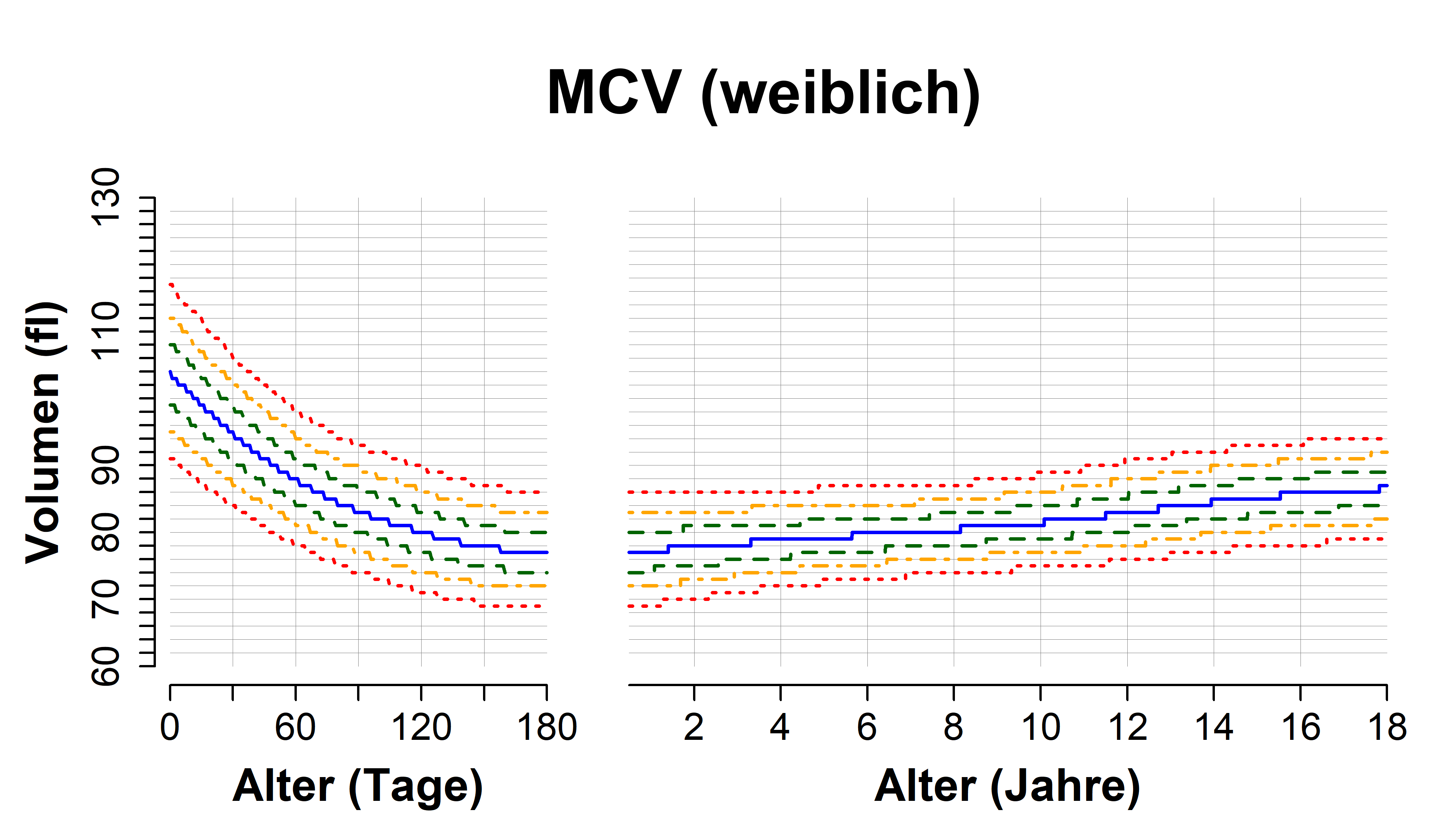 Im Folgenden sind die Perzentilenkurven der Erythrozytenindizes MCH, MCHC und MCV basierend auf bei > 300.000 Kindern und Jugendlichen erhobenen Werten abgebildet sowie die Perzentilenkurven der Erythrozytenverteilungsbreite (RDW) von > 80.000 Kindern und Jugendlichen. Abb. M. Metzler/ J. Zierk, Universitätsklinikum Erlangen